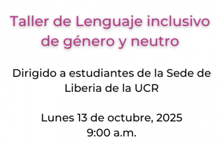 Desde la Biblioteca del CIEM, ofrecemos Talleres grupales de Lenguaje Inclusivo y Neutro, así como asesorías individuales sobre el tema, como parte del proyecto "Cultura del Lenguaje Inclusivo de Género y Neutro en Costa Rica", coordinado por la Mag. Marina Rivera Vargas y con la colaboración de la tesiaria en Maestría Académica de Lingüística, Montserrat Casasola Romero, experta en lingüística y género. Contamos también con el apoyo de las estudiantes de Enseñanza del Castellano y Filología Española, Noylin Cerdas Centeno y Ana Lía Camacho Leiva. El próximo taller es dirigido a estudiantes de la Sede de Liberia de la UCR. Día: 13 de octubre, 2025 Hora: 9:00 a.m. Lugar: Edificio CIEM Les invitamos a consultar el servicio "Caja de Herramientas Lenguaje Inclusivo de Género y Neutro" ofrecido en la sitio web del CIEM y el sitio sitio web "Lenguaje inclusivo, diversidad y género" del CIEM, donde se encuentra material de apoyo para la comunicación no sexista cotidiana, académica y profesional. Pueden solicitar más información a través del WhatsApp 2511-1951 o el correo biblioteca.ciem@ucr.ac.cr Más información: 2511-1951 | biblioteca.ciem@ucr.ac.cr https://ciem.ucr.ac.cr/lenguajeinclusivohttps://ciem.ucr.ac.cr/cursos-ofrecidos/lenguajeinclusivo http://lenguajeinclusivo.ucr.ac.cr/