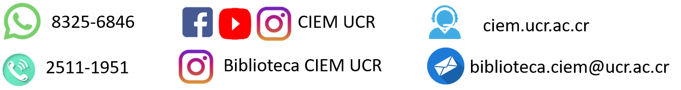 Puede contactarnos en redes sociales, correo electrónico, teléfono fijo y WhatsApp. Más información en http://www.ciem.ucr.ac.cr/BibliotecaCIEM [cambiar link]